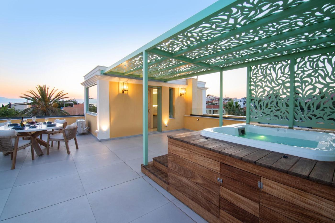 Deluxe Suite with Spa Bath. The hot tub and spa bath are the standout features of this suite. Boasting 2 bedrooms, this spacious suite has 2 bathrooms with a shower, a seating area and terraceyou can relax. In the fully equipped kitchenette, guests will find a stovetop, a refrigerator, kitchenware and a microwave. The air-conditioned suite features a flat-screen TV, a washing machine, a tea and coffee maker, a wardrobe as well as sea views. The unit offers 2 beds.