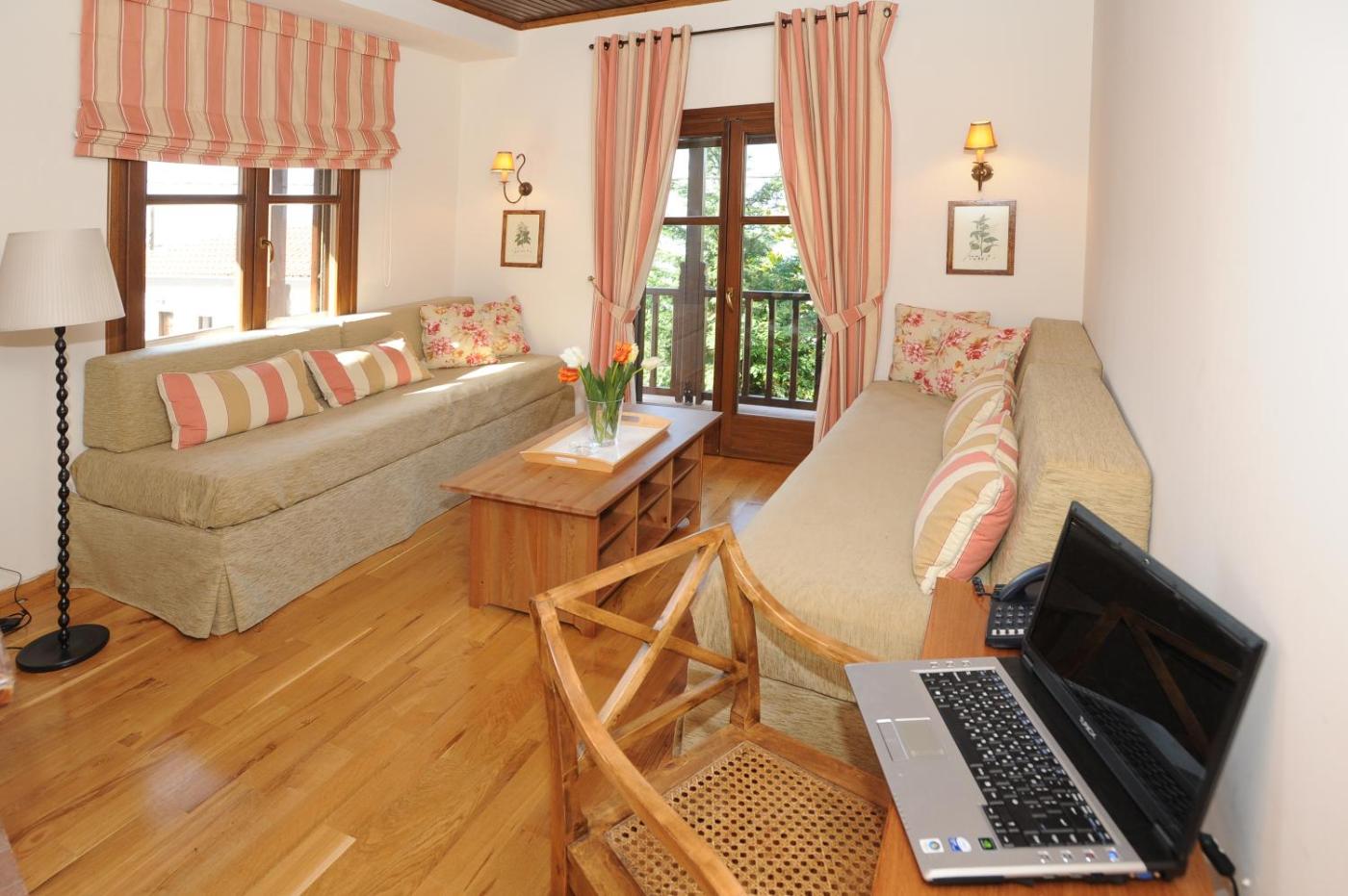 Executive Room. Decorated with warm colours, this generous sized room has 1 double bed, 1 double sofa bed and a fireplace. It has a spacious bathroom with a hydro massage shower or bath. Some also include a furnished balcony with sea view, while some boast sea views from the luminous window. Some rooms feature stone walls. ;