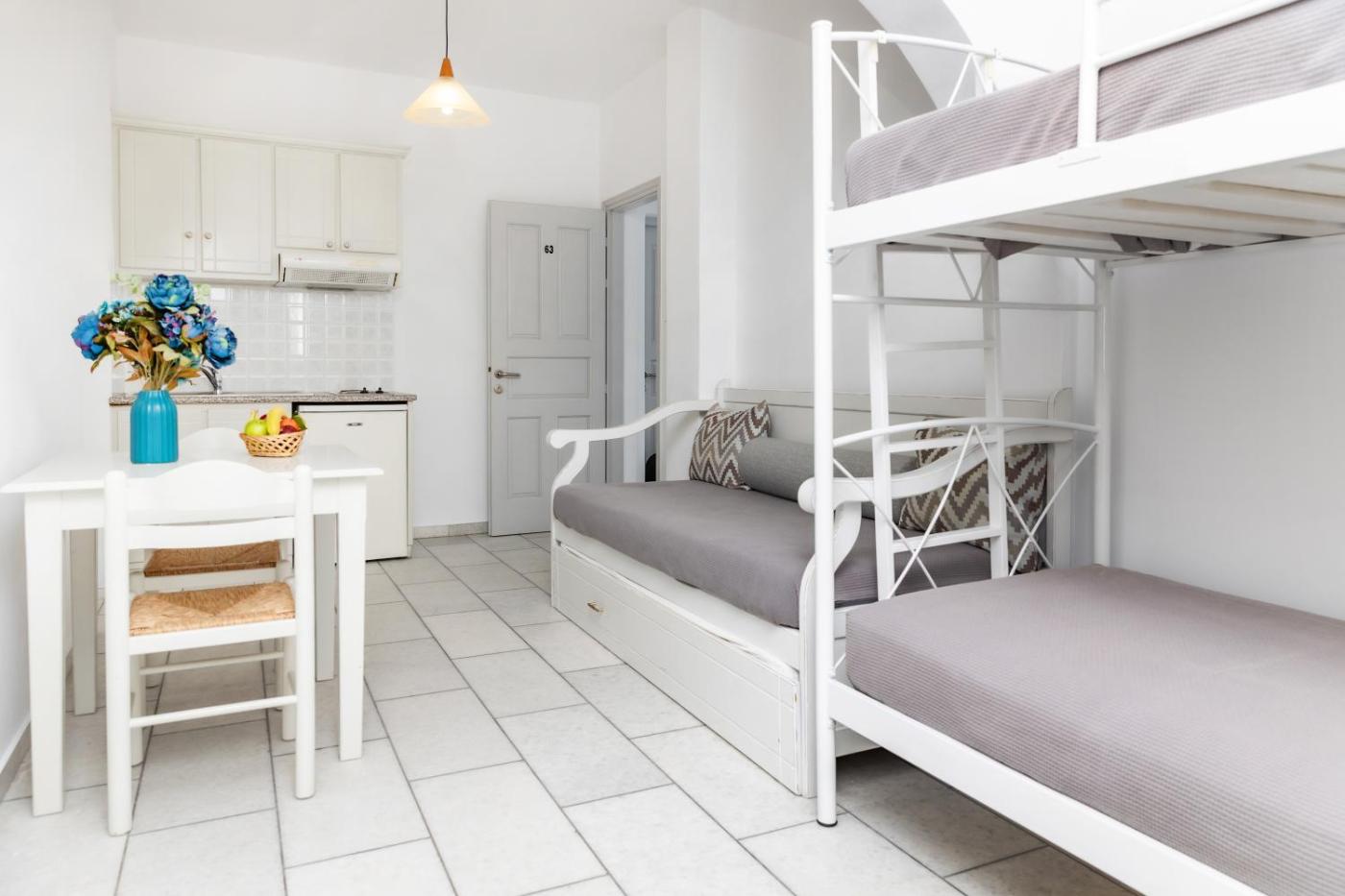 Family Studio. The family room features air conditioning, a private entrance, as well as a private bathroom boasting a shower and a hairdryer. In the well-equipped kitchenette, guests will find a stovetop, a refrigerator, kitchenware and an electric kettle. A sofa, a flat-screen TV, a wardrobe and a balcony are available in this family room. The unit has 4 beds.